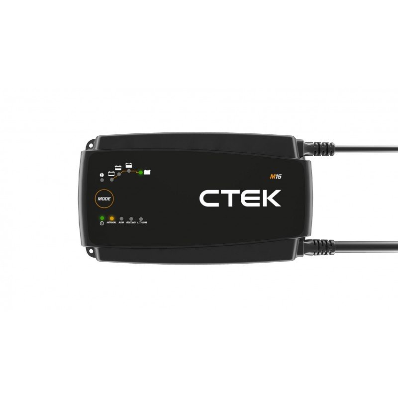 CTEK M15 je nová verze nabíječky M200 (již není k dostání), která nabízí spoustu vylepšení. Jde o plně automatickou osmikrokovou nabíječku, řízenou mikroprocesorem. Nabíjecí proud je 15 A. Je určena pro 12 V baterie od 28 do 300 Ah. CTEK M15 je 12V nabíječka ideální pro použití na lodích a v karavanech. Je vhodná pro nabíjení a udržování olověných baterií všech druhů včetně AGM, GELových a Lithiových baterií. 4m dlouhý připojovací kabel je navíc zakončen i teplotním čidlem, díky němuž dokáže CTEK M15 efektivně regulovat parametry nabíjení. K další výbavě patří režimy „RECOND“ pro regenerování hluboce vybitých akumulátorů. M15 může zůstat libovolně dlouho připojen, přičemž baterie udržuje v nejlepší možné kondici. Stačí tlačítkem zvolit požadovaný režim.