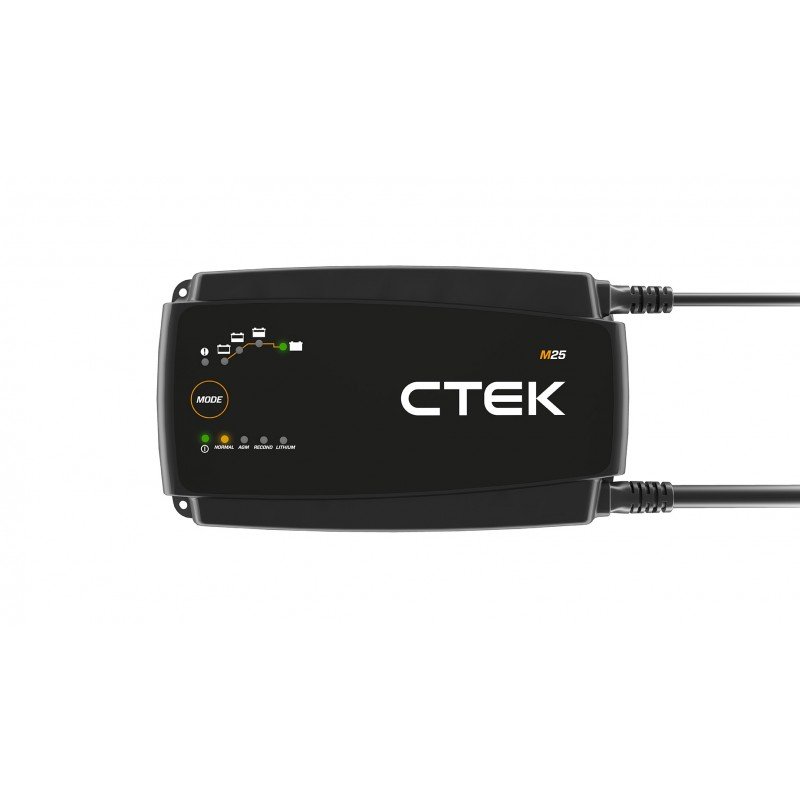 CTEK M25 je nová verze nabíječky M300 (již není k dostání), která nabízí spoustu vylepšení. Jde o plně automatickou osmikrokovou nabíječku, řízenou mikroprocesorem. Nabíjecí proud je 25 A. Je určena pro 12 V baterie od 40 do 500 Ah. CTEK M25 je 12V nabíječka ideální pro použití na lodích a v karavanech. Je vhodná pro nabíjení a udržování olověných baterií všech druhů včetně AGM, GELových a Lithiových baterií. 4m dlouhý připojovací kabel je navíc zakončen i teplotním čidlem, díky němuž dokáže CTEK M25 efektivně regulovat parametry nabíjení. K další výbavě patří režimy „RECOND“ pro regenerování hluboce vybitých akumulátorů. M25 může zůstat libovolně dlouho připojen, přičemž baterie udržuje v nejlepší možné kondici. Stačí tlačítkem zvolit požadovaný režim.