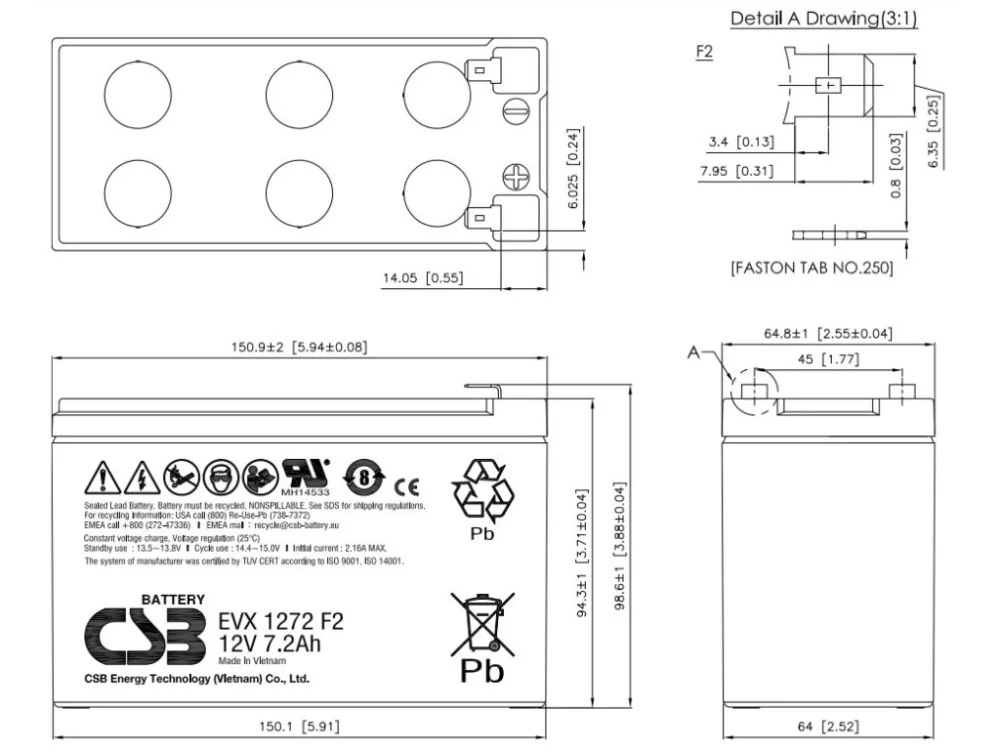 EVX1272F2 12V 7,2Ah – záložní, bezúdržbový, VRLA, uzavřený, akumulátor od CSB Battery. Technologie AGM. Určený pro cyklický provoz.